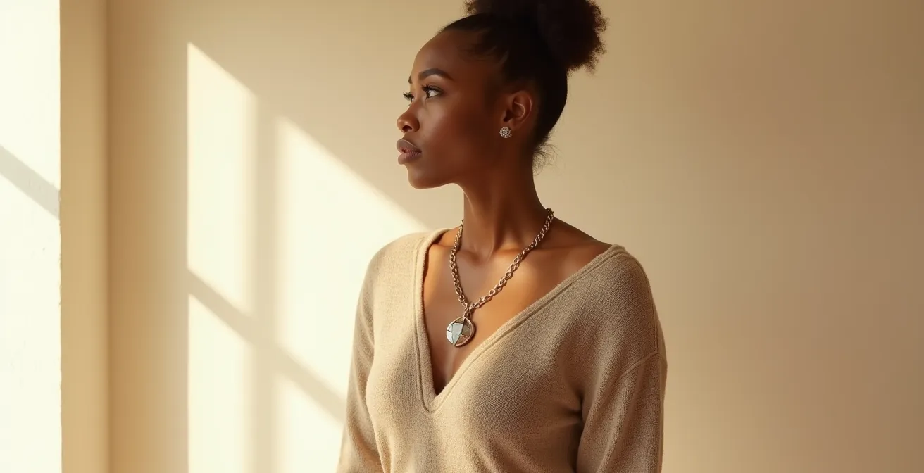 - Le cas du pendentif : Pour une forte poitrine, un pendentif qui arrive juste au-dessus du creux des seins est idéal. Il attire le regard sur ce point précis sans ajouter de volume directement sur la poitrine.